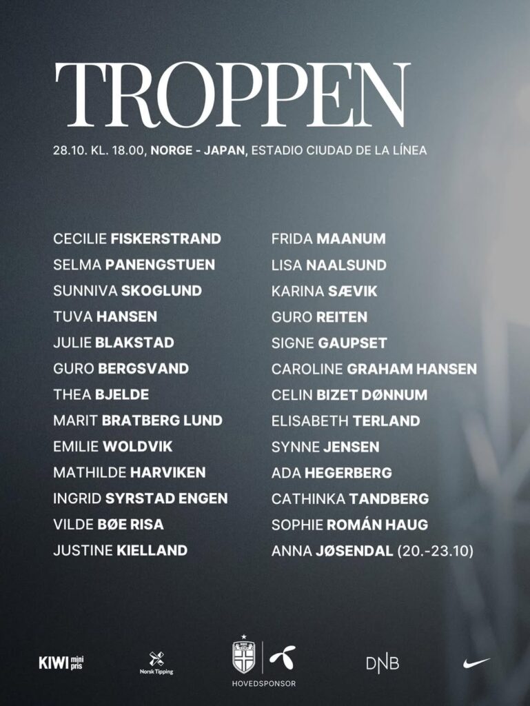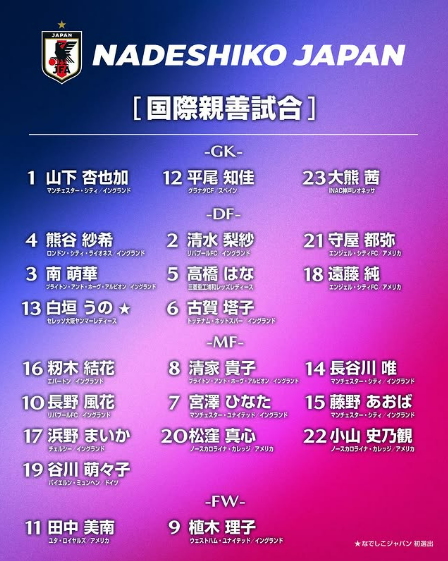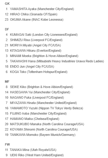 En este listado de la selección japonesa ha habido dos cambios en la convocatoria. Se han caído Yuzuki Yamamoto (16) e Hikaru Kitagawa (13), entrando por ellas Yuka Momiki (Everton) y Uno Shiragaki (Cerezo Osaka). Además, no estará Manaka Matsukubo, lesionada.