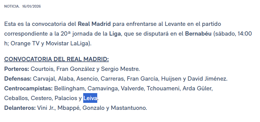 El extremo algecireño Álvaro Leiva es una de las grandes novedades en la convocatoria del primer equipo del Real Madrid para el choque de mañana sábado ante el Levante Unión Deportiva en el ‘Santiago Bernabéu’ a partir de las 14:00 horas.