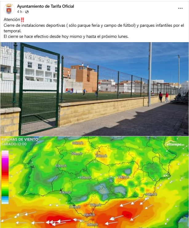 Por un lado, el encuentro entre la Unión Deportiva Tarifa B y el Club Deportivo Benalup, de la Tercera Andaluza, ha quedado aplazado debido a que el Ayuntamiento tarifeño ha decretado el cierre de las instalaciones deportivas al aire libre debido al temporal que se espera en la zona del Estrecho y especialmente al viento que puede azotar la ciudad
