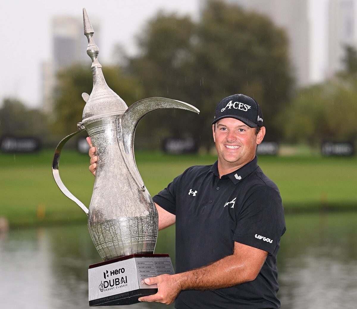 El estadounidense Patrick Reed posa con el título del Hero Dubai Desert Classic/FOTO: DP World Tour