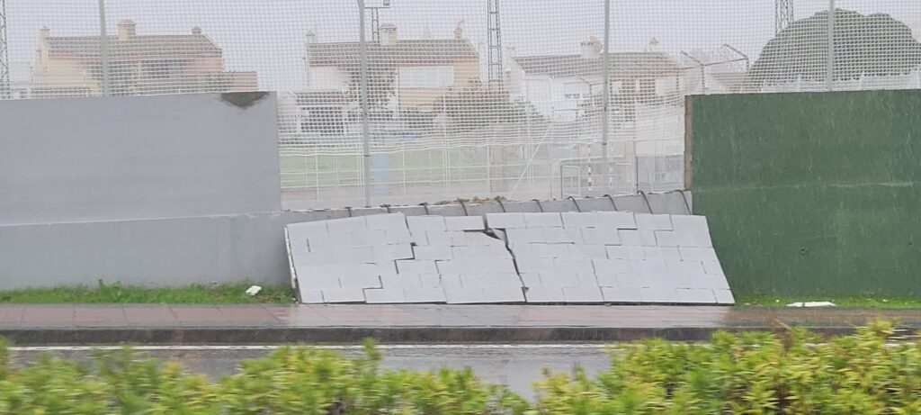 La borrasca ‘Kristin’, que está azotando a prácticamente toda la península, se ha dejado sentir, entre otras localidades, en Algeciras, donde por ejemplo, entre las muchas incidencias que se han registrado, está la caída de parte del muro perimetral del Polideportivo ‘Lorenzo Pérez -Loren-‘, en la barriada de San García, cerca de la carretera principal que discurre a su lado, aunque no tiene incidencia para los vehículos.