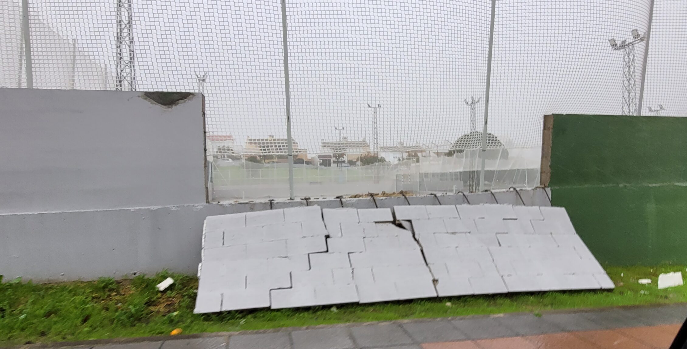 El fuerte viento hace caer una parte de la pared del complejo algecireño ♦ Está en la zona más cercana a la carretera ♦ La Delegación de Deportes y la de Obras y Servicios trabajarán en breve para su reparación