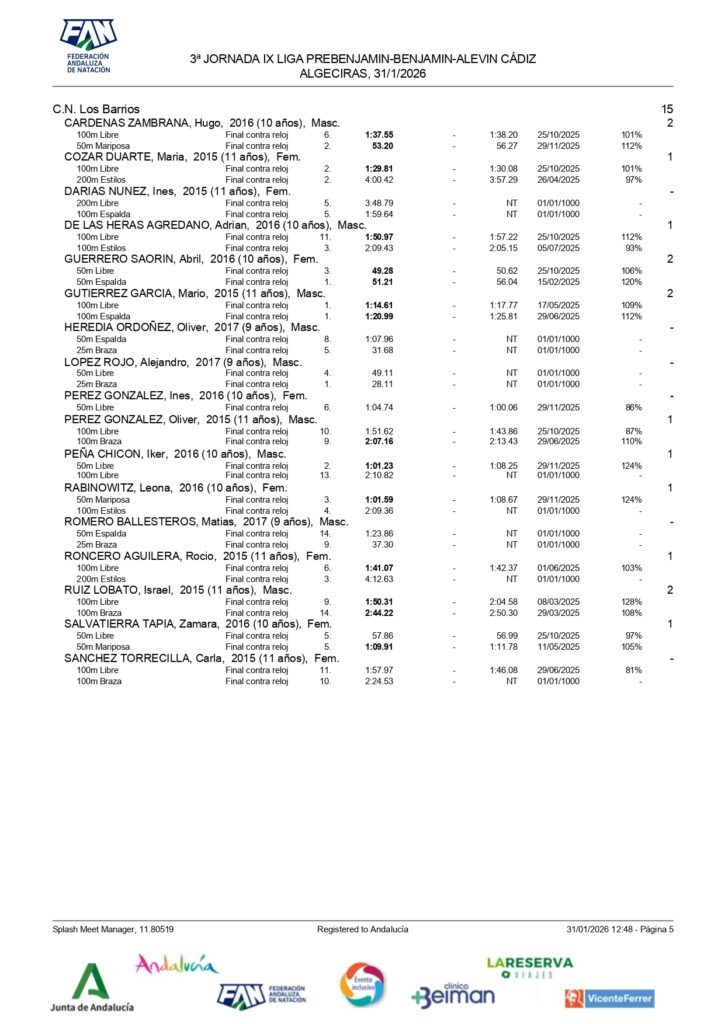 El Club Natación Los Barrios ha participado hoy en la tercera jornada de la IX Liga Prebenjamín-Benjamín-Alevín que ha tenido lugar en Algeciras, donde los sus jóvenes nadadores han conseguido 15 mejoras de tiempo, con nada menos que cuatro dobletes (Hugo Cárdenas, Abril Guerrero, Mario Gutiérrez e Israel Ruiz). Precisamente, Gutiérrez también ha sido primero en sus dos pruebas (100 Libre y 100 Espalda), destacando otros dos campeones como la propia Guerrero (50 Espalda) y Alejandro López Rojo en 25 Braza.