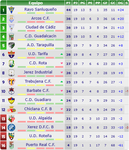La Unión Deportiva Tarifa ha derrotado por 3-0 en la visita al ‘Antonio López Púa’ del Puerto Real Club de Fútbol, el muy colista de la Primera Andaluza Gaditana. Mientras los locales se colocan a dos puntos de la quinta plaza, que actualmente ocupa la Agrupación Deportiva Taraguilla, los verdiblancos, otrora uno de los equipos referencia de la provincia, se quedan a 18 puntos de la salvación con 33 por jugarse, pero si sigue esta trayectoria -sólo una victoria- y al Chiclana B (que hoy ha perdido ante el antepenútimo por 0-1) le da por ganar, en tres jornadas estarían matemáticamente descendidos.