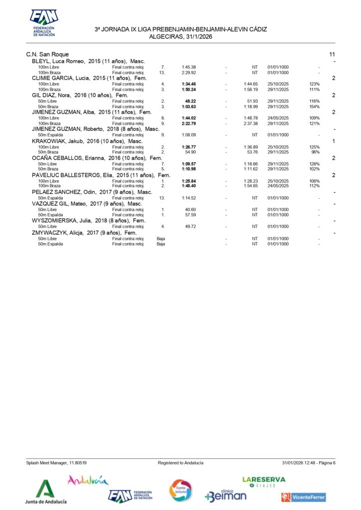 El Club Natación San Roque ha participado hoy en la tercera jornada de la IX Liga Prebenjamín-Benjamín-Alevín que ha tenido lugar en Algeciras, donde los sus jóvenes nadadores han conseguido 11 mejoras de tiempo, con nada menos que cinco dobletes (Lucía Climie, Nora Gil, Alba Jiménez, Eriannna Ocaña y Elia Paveliuc). Curiosamente, en posiciones, ha sido dos veces primero Mateo Vázquez Gil (50 Libre y 50 Espalda), pero en su caso no ha podido ganar a su crono.