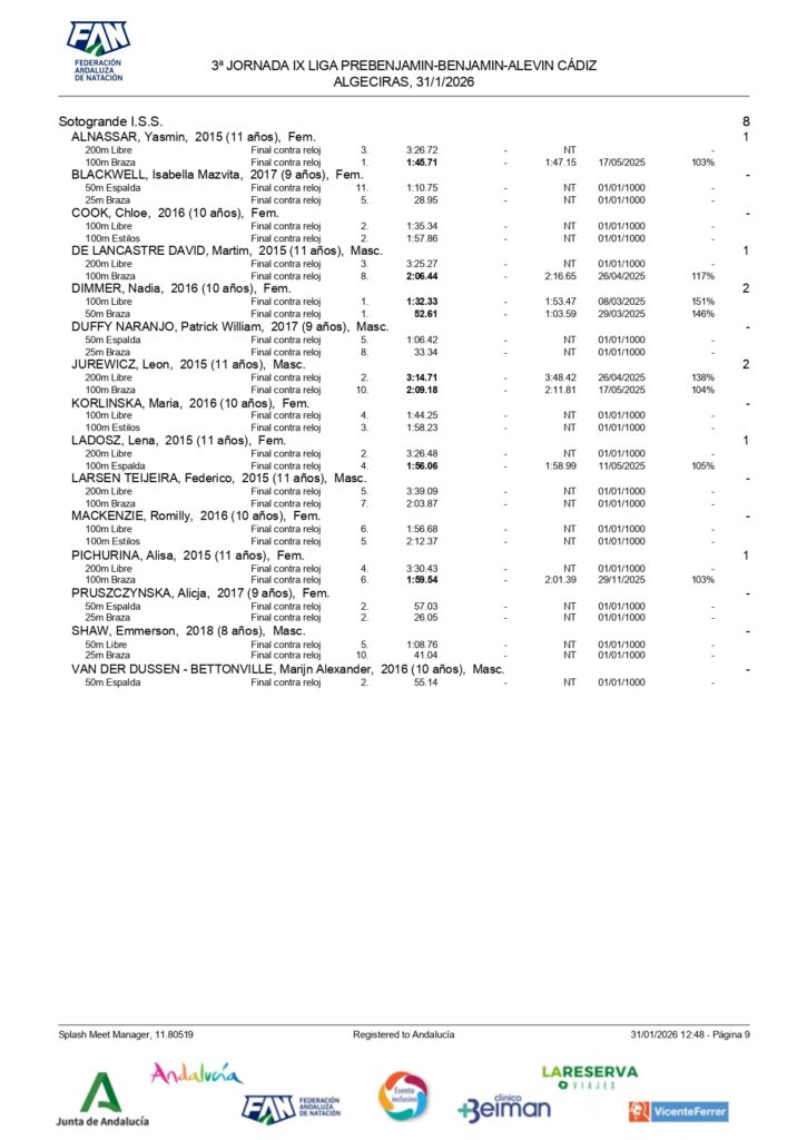 El equipo de natación de Sotogrande International School ha participado hoy en la tercera jornada de la IX Liga Prebenjamín-Benjamín-Alevín que ha tenido lugar en Algeciras, donde los sus jóvenes nadadores han conseguido ocho mejoras de tiempo, destacando Nadia Dimmer (10 años) con sendos primeros puestos en 100 Libre y 50 Braza, logrado tener dos nuevas marcas en su trayectoria.