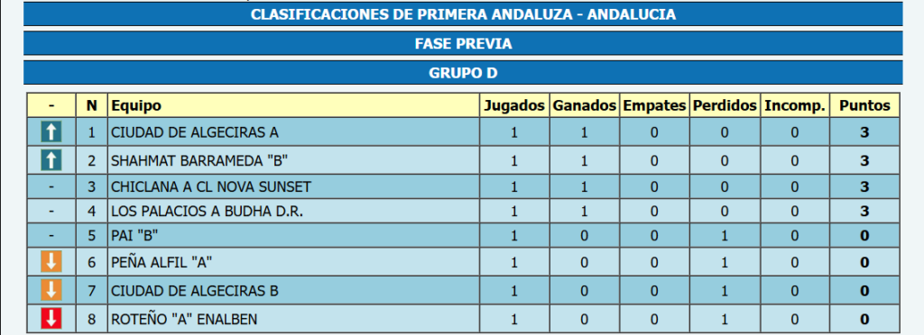 Este pasado domingo comenzó la competición en la Primera Andaluza de ajedrez. Y en el Grupo D, en este primera jornada, se han enfrentado los dos equipos del Club Ajedrez Ciudad de Algeciras, donde el equipo A se ha impuesto por 4,5 a 0,5 al conjunto B.