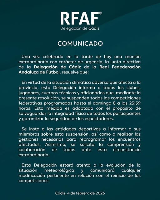 La Delegación Gaditana de Fútbol ha emitido un comunicado en el que anuncia que «en virtud de la situación climática adversa que afecta a la provincia, esta Delegación informa a todos los clubes, jugadores, cuerpos técnicos y aficionados que, mediante la presente resolución, se suspenden todas las competiciones federativas programadas hasta el domingo 8 a las 23:59 horas. Esta medida es adoptada con el propósito de salvaguardar la integridad física de todos los participantes y garantizar la seguridad de los espectadores».