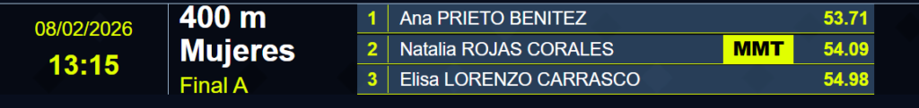La velocista de la Villa se ha impuesto a la madrileña del AD Maratón, Natalia Rojas Corales (54.09) -que el pasado diciembre logró el récord de Madrid Sub-20 con 54.23- y la colmenareña del Club Atletismo Perceiana Extremadura, Elisa Lorenzo Carrasco (54.98), curiosamente compañera de Prieto en la selección española medalla de plata en el Campeonato de Europa de Atletismo U23, celebrado en Bergen (Noruega)