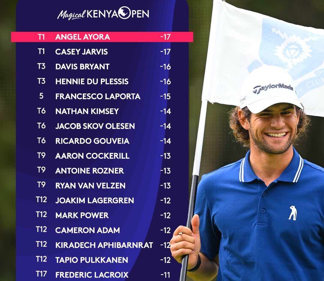 El malagueño Ángel Ayora Fanegas, de La Hacienda Links Sotogrande y canterano del Club de Golf La Cañada, tiene a tiro inaugurar su palmarés de victorias en el DP World Tour, después de firmar este sábado una brillante tarjeta de 64 golpes (-6) en la tercera jornada del Magical Kenya Open que se disputa en Nairobi, y que le ha llevado al coliderato de la prueba junto al sudafricano (Boksburg) Casey Jarvis, ambos -17.