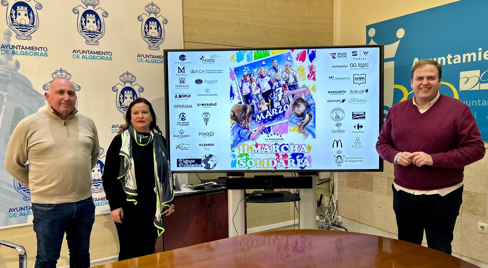 El teniente de alcalde delegado de Educación en el Ayuntamiento de Algeciras, Javier De las Montañas Vázquez Hueso, y la directora del Colegio La Inmaculada, Nuria Muñoz Molina, junto a Antonio Arjona Román, representante de las familias organizadoras, han presentado esta mañana en el Consistorio la segunda edición de la Marcha Solidaria que desarrolla este centro educativo, y que tendrá lugar el próximo sábado.