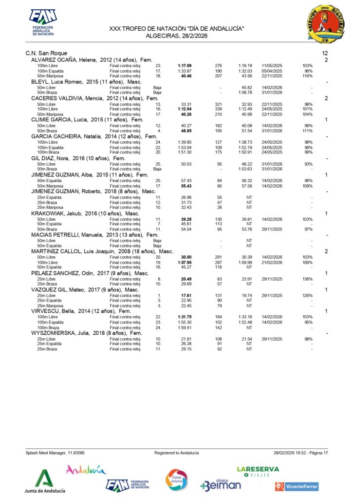 El Club Natación San Roque ha estado presente en el XXX Trofeo ‘Ciudad de Algeciras-Día de Andalucía’, clasificándose en el duodécimo puesto con un total de 166 puntos.