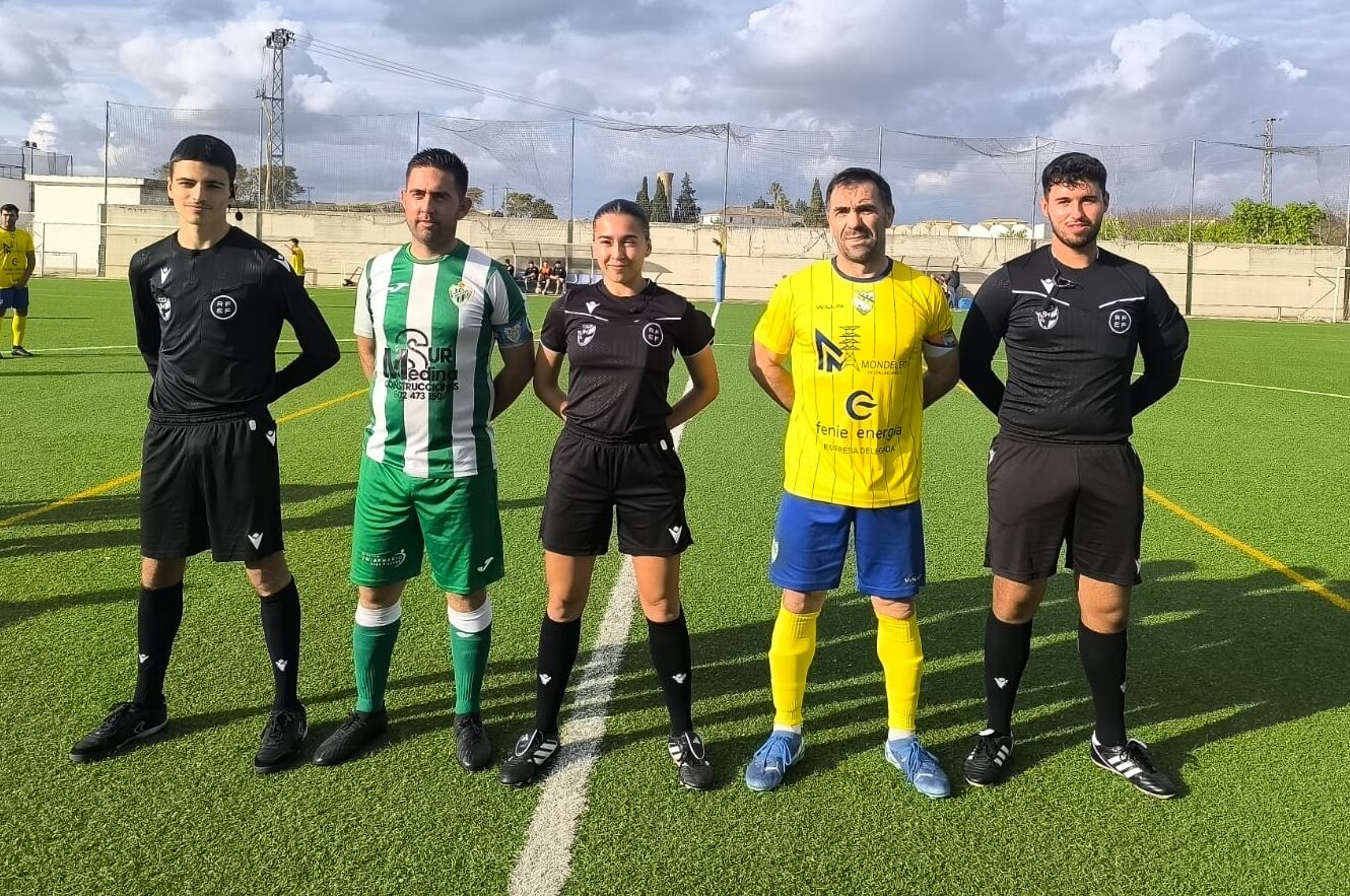 Los capitanes de CD Jédula (Marcos Segovia) y de UD Tesorillo (Sergio Lata) con los colegiados, encabezado por la jerezana Soledad Asensio Junquera/FOTO: DsCG