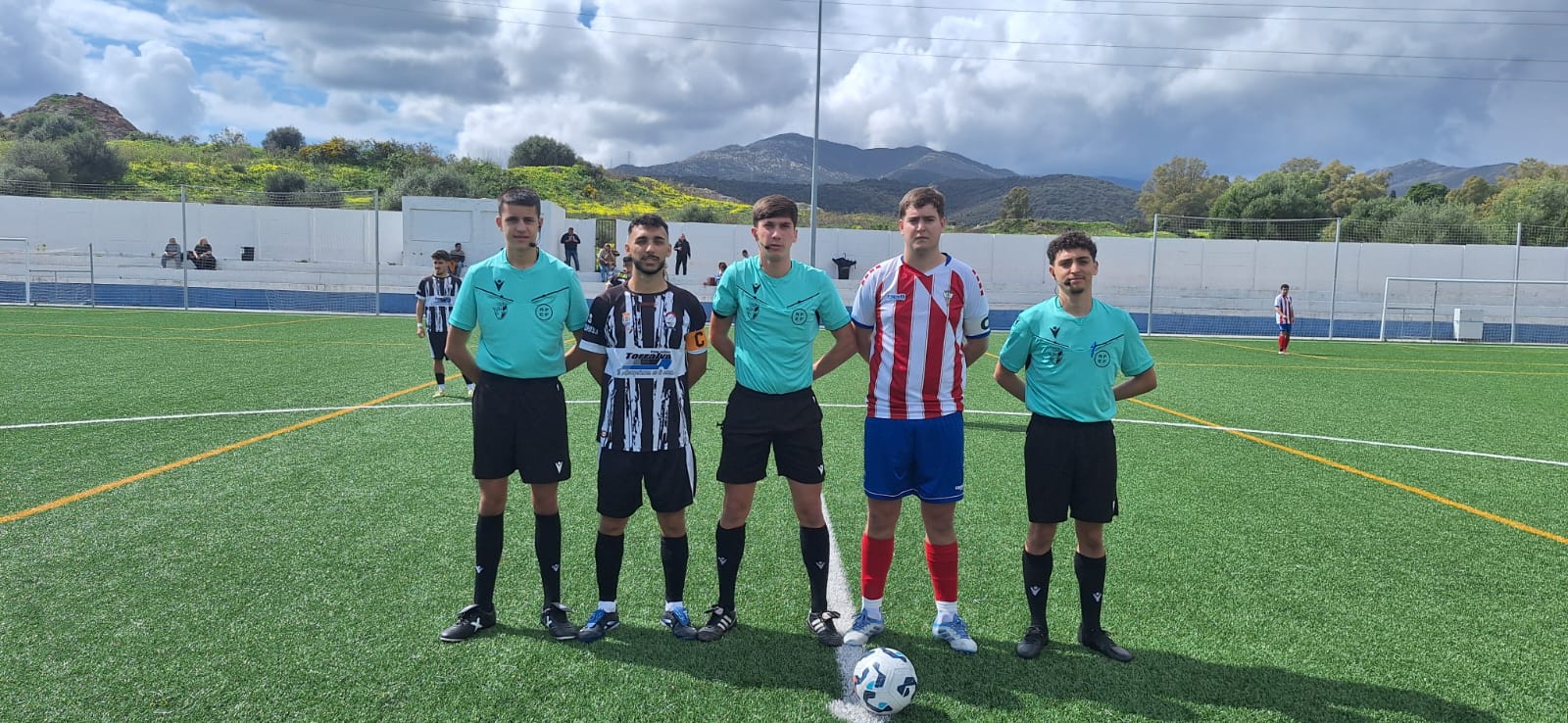Los capitanes de Algeciras CF B y AD Nueva Jarilla posan con el trío arbitral/FOTO: DsCG
