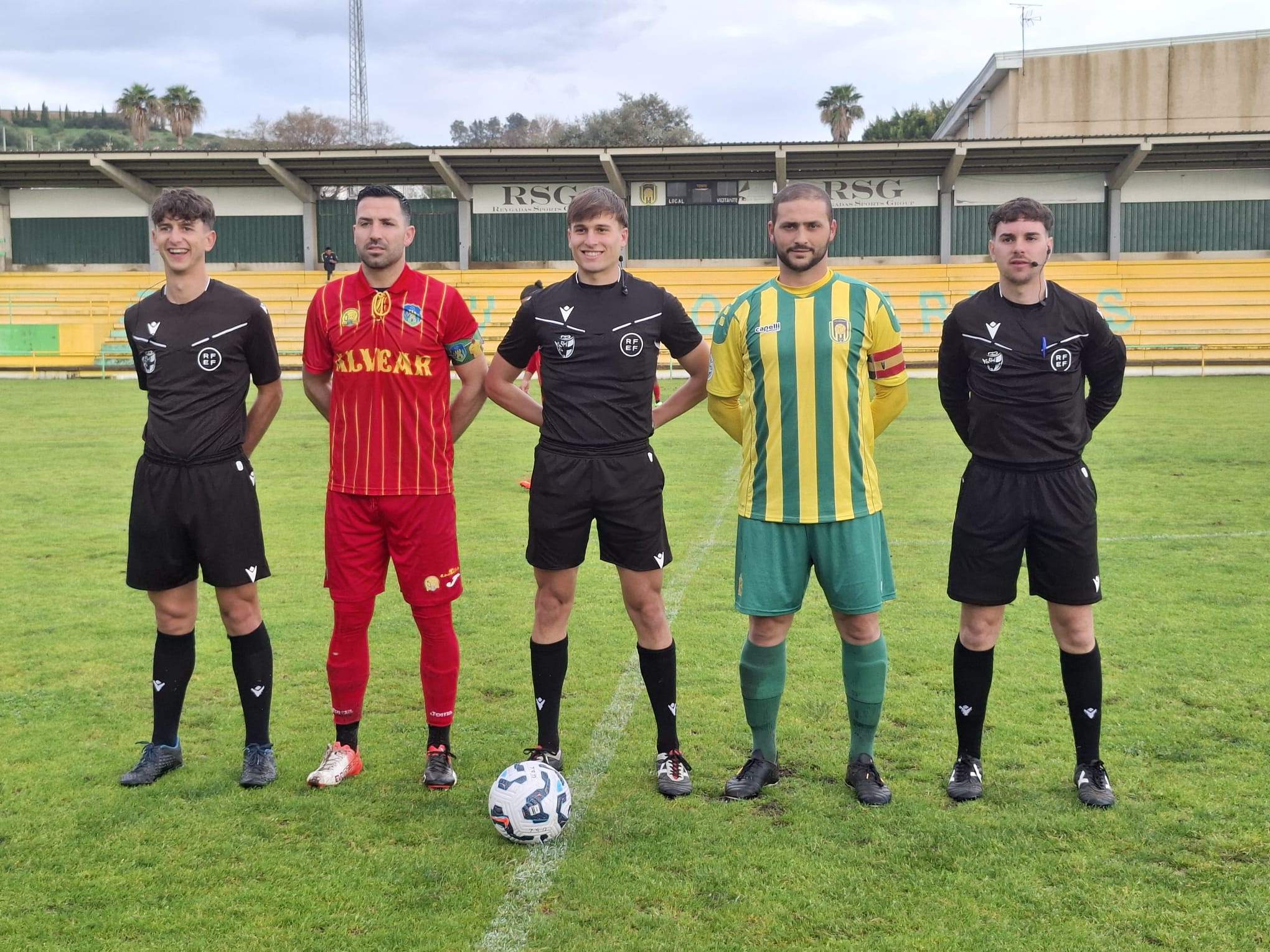 Los capitanes de Montilla CF (Carraña I), y UD Los Barrios (Juanjo Pérez) posan con el equipo arbitral, liderado por el sevillano Daniel Zschiedrich/FOTO: Susana Camacho