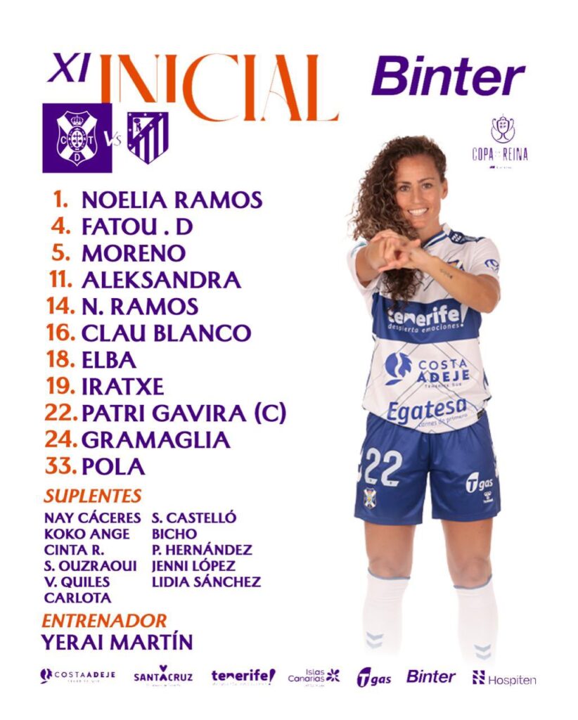 El Costa Adeje Tenerife, donde milita la sanroqueña Patricia Gavira Collado -es la capitana-, ha caído eliminado de las semifinales de la Copa de Su Majestad La Reina tras perder por 0-1 frente al Atlético de Madrid en el ‘Heliodoro Rodríguez López’. Ya las colchoneras había ganado en la ida por el mismo marcador.
