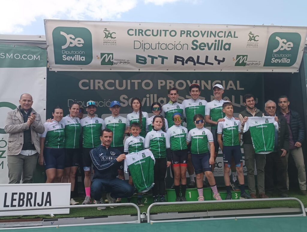 Jimena Olmedo, en el centro de la imagen, de pie y con gafas, con el resto de campeones del Circuito Diputación de Sevilla BTT/FOTO: FACiclismo