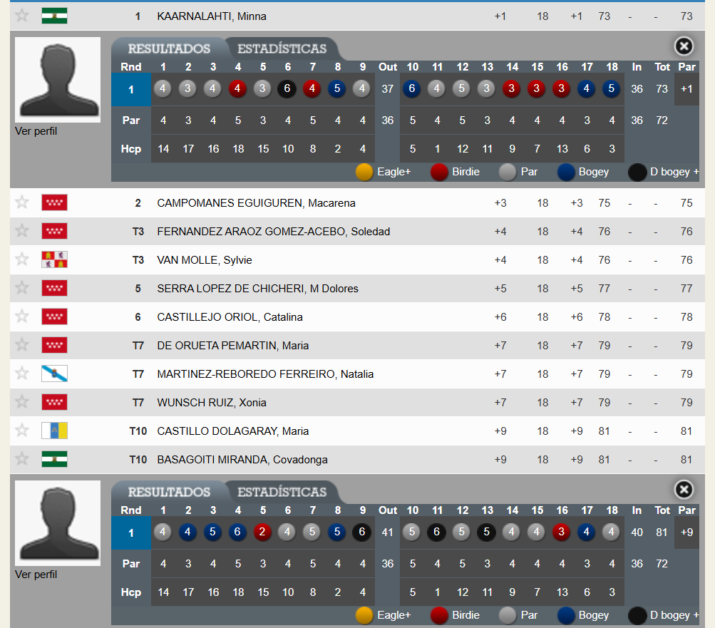 La tercera posición provisional de esta prueba la comparten otras dos de las golfistas ilustres de la especialidad, la también madrileña Soledad Fernández Araoz y la castellanoleonesa Sylvie van Molle, ambas con unas tarjetas de 76 golpes (+4).