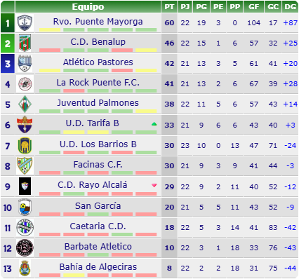 Los del ‘López Púa’ aún podrían alcanzar la tercera plaza (habría que ver luego si por coeficiente le daría para ser el mejor tercero de los tres grupos), pero para eso deberían ganar los nueve puntos (luego tienen que recuperar el duelo ante el cuarto, el CD La Rock Puente, para cerrar la liga en Puente Mayorga ante el campeón) y esperar que no ganen ni el Atlético Pastores (Barbate, Facinas y Palmones) ni los rockeros (Palmones, Tarifa y San García); y que los palmoneños (La Rock y Pastores) no sumen más de tres puntos.