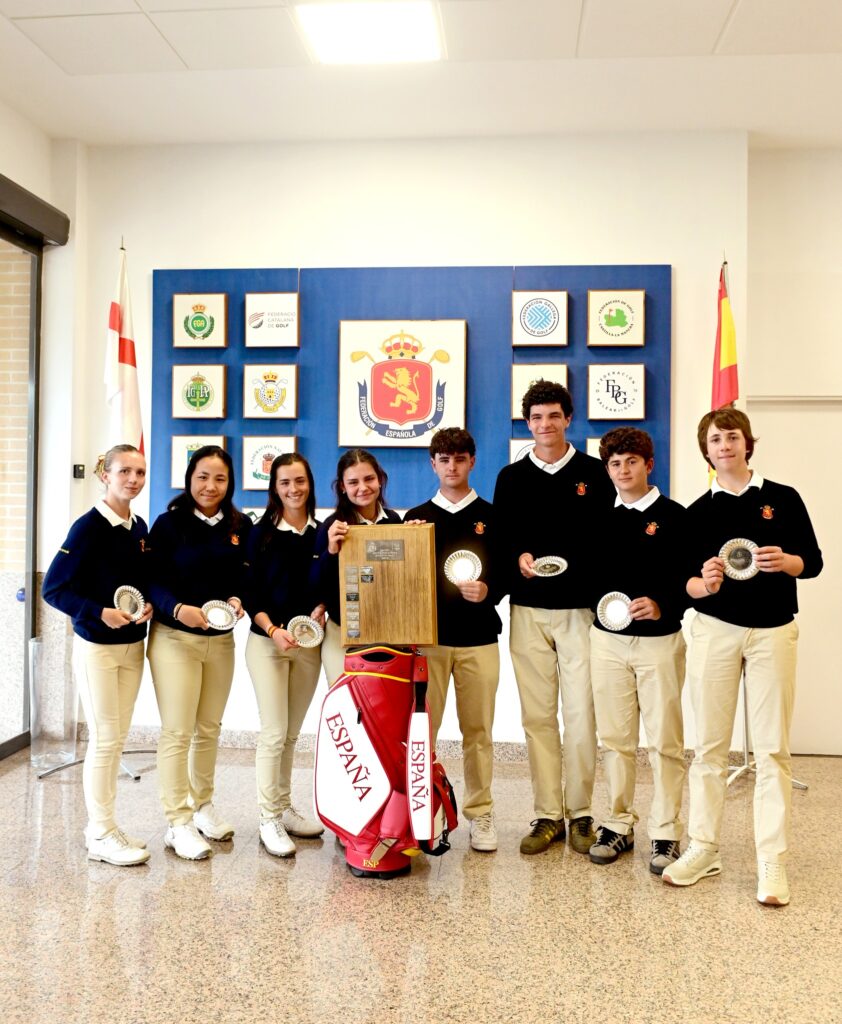 Martín Cervera, primero por la derecha, con el resto del equipo nacional Sub-16 tras ganar a Inglarterra/FOTO: rfegolf