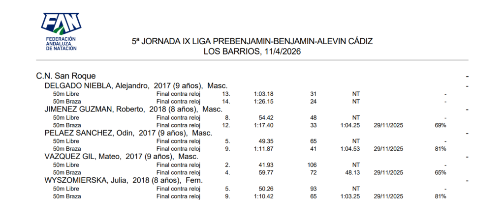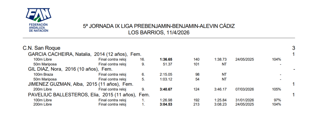 La piscina de Los Barrios albergó el sábado la quinta jornada de la IX Liga Prebenjamín, Benjamín y Alevín de natación, cita donde ha estado el Club Natación San Roque con un grupo reducido, pero muy entregado y disciplinado, logrando tres nuevas marcas personales, todas en el denominado Campeonato RFEN.