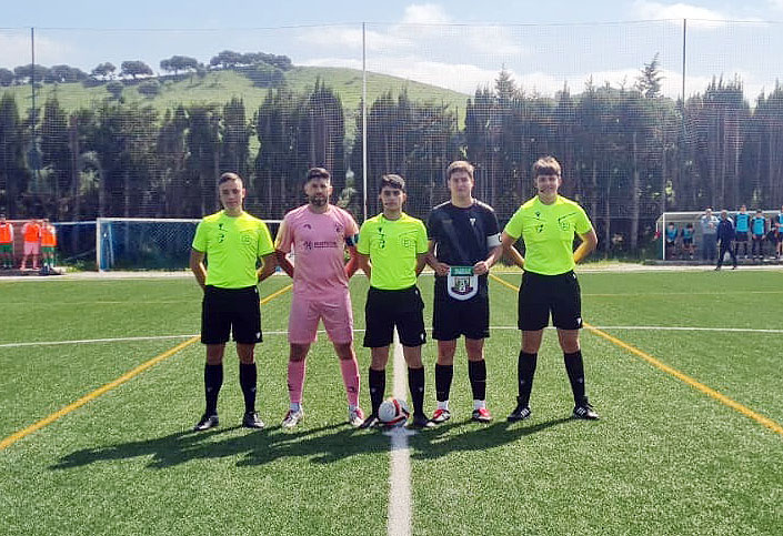 Los capitanes de Athletic Jimena (Fernando) y Algeciras B (José Varela), con el trío arbitral/FOTO: DsCG