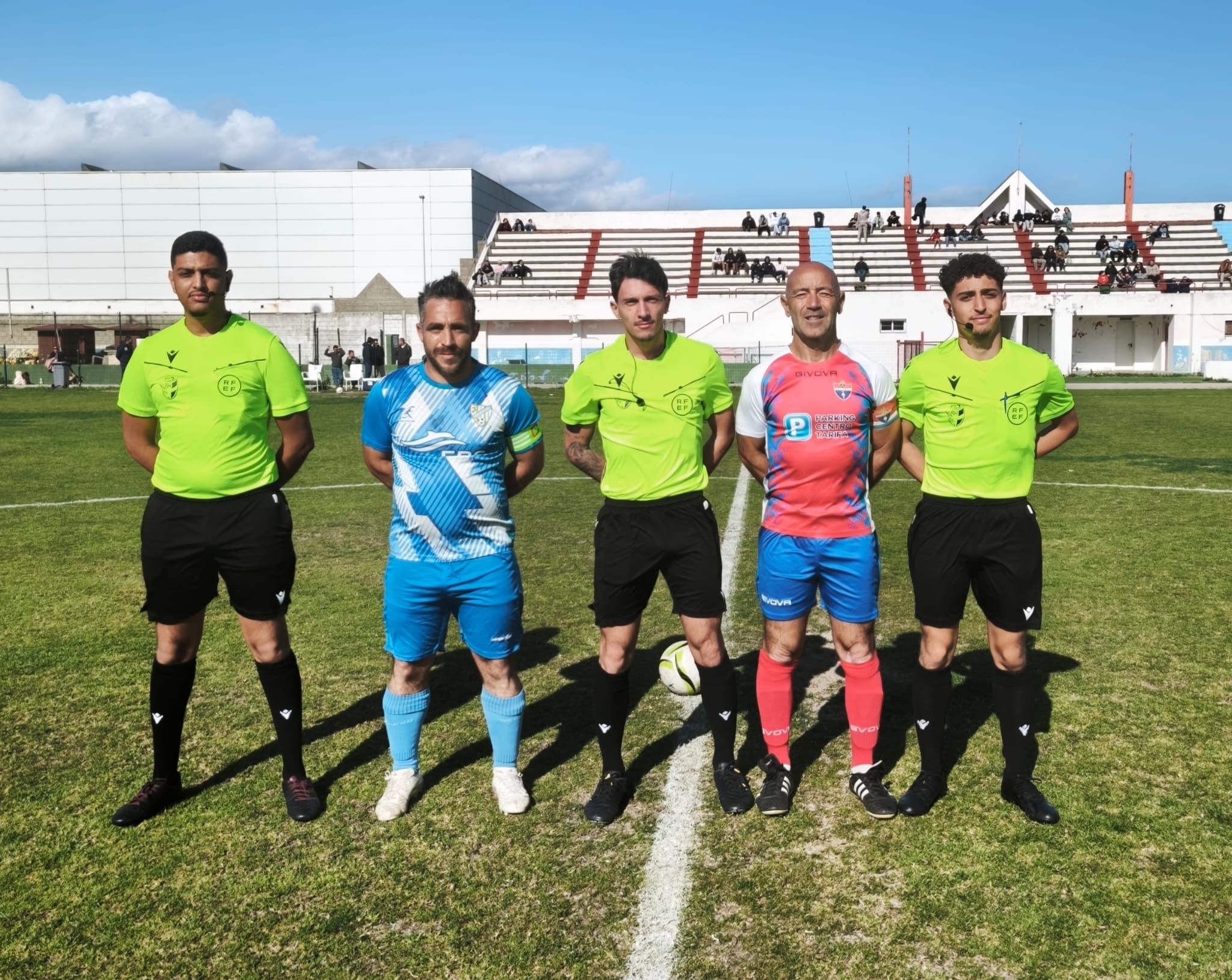Los capitanes de Facinas CF (Chupeta) y Tarifa B (Juan Mari Jurado), con el trío arbitral/OTO: DsCG