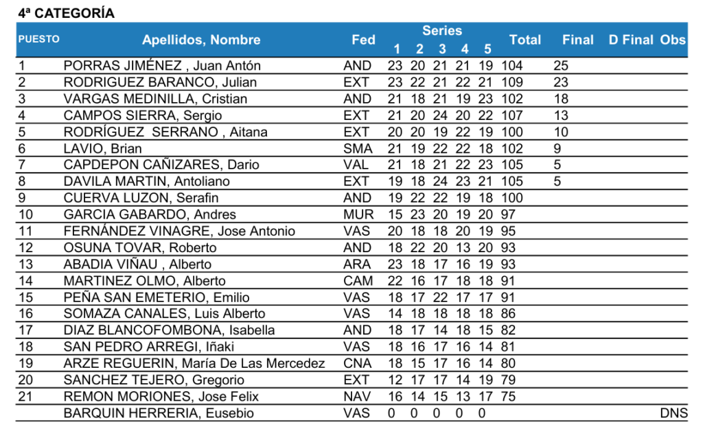 En 4ª Categoría, la fase de clasificación estuvo liderada por Julián Rodríguez Baranco con 109 platos, seguido por Sergio Campos Sierra (107) y un empate a 105 entre Darío Capdepón Cañizares y Antoliano Dávila Martín. Juan Antón Porras Jiménez entró con 104 platos, seguido de Cristian Vargas Medinilla (102), Brian Lavio (102) y Aitana Rodríguez Serrano (100).