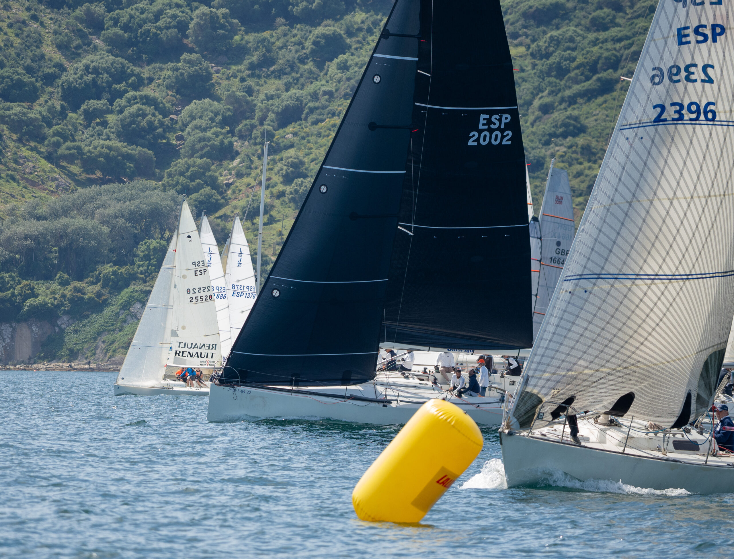 Aquí, la intensidad del viento ha aumentado hasta los 12 nudos en las inmediaciones de la señal de navegación de sotavento, pasado Cala Arena. Uno de los momentos más espectaculares de la prueba se ha vivido tras el paso por la boya cardinal, cuando la flota izó sus spis para navegar hacia la chata frente a la urbanización de Punta Carnero, regalando una imagen de gran belleza en el Estrecho.