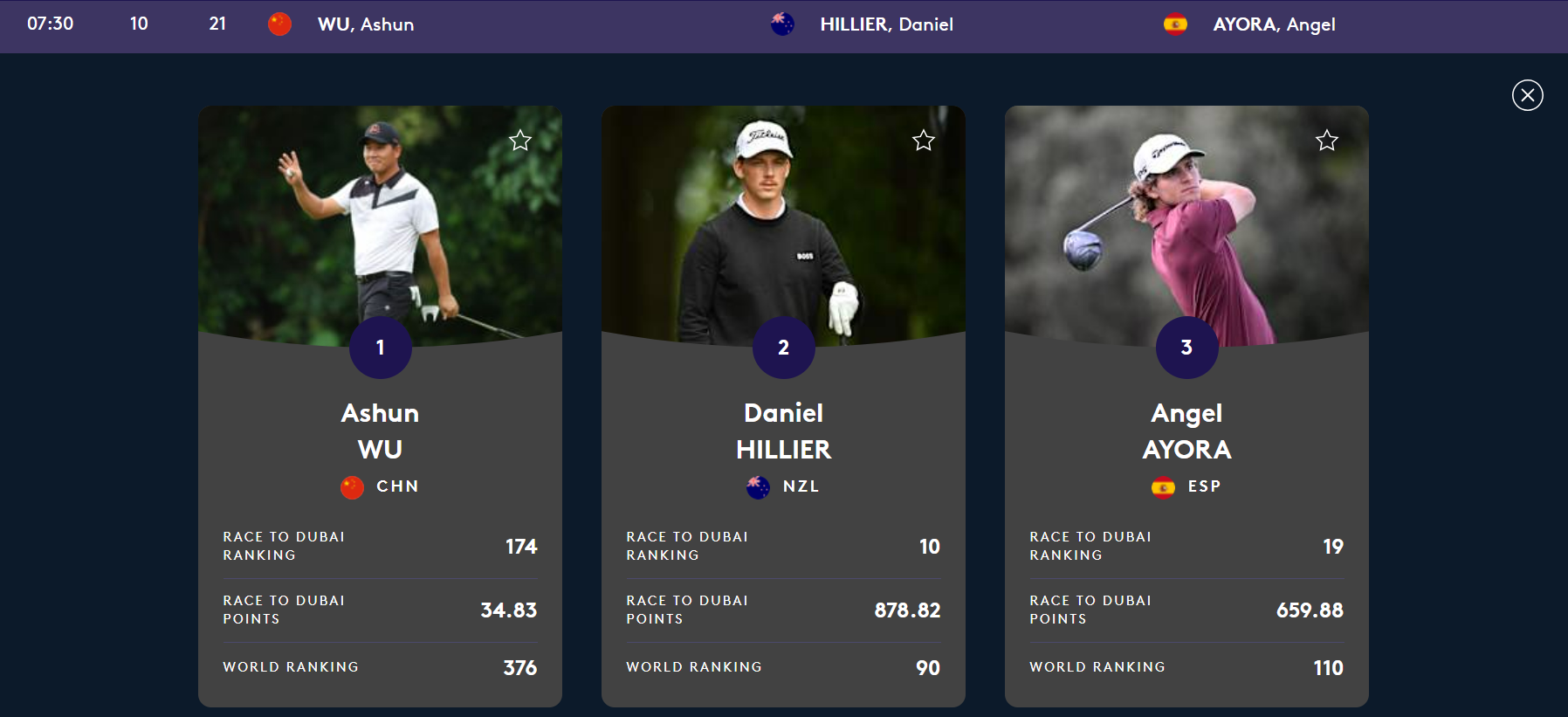 Ayora saldrá al campo mañana viernes a las 7:30 horas (seis horas menos en España) desde el tee del 10 junto al local (de Xiamen) Ashun Wu -dos veces campeón del torneo, en 2015 y 2025- y el neozelandés (de Wellington) Daniel Hillier.