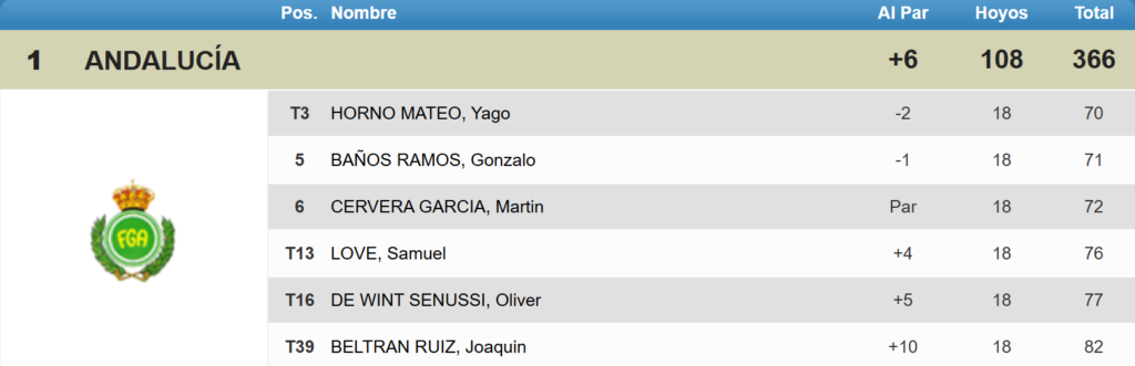 El conjunto de Andalucía (+6) ha comenzado el Campeonato de España por Federaciones Autonómicas de categoría Sub-18 de Primera División de la mejor manera posible, liderando la ronda clasificatoria en el campo de Golf Rioja Alta (Cirueña, La Rioja). En su camino hacia el que puede ser su sexto título consecutivo, su rival en cuartos de final será el representante de Principado de Asturias.