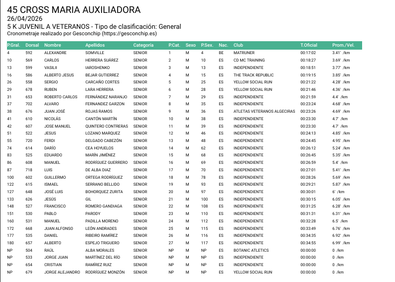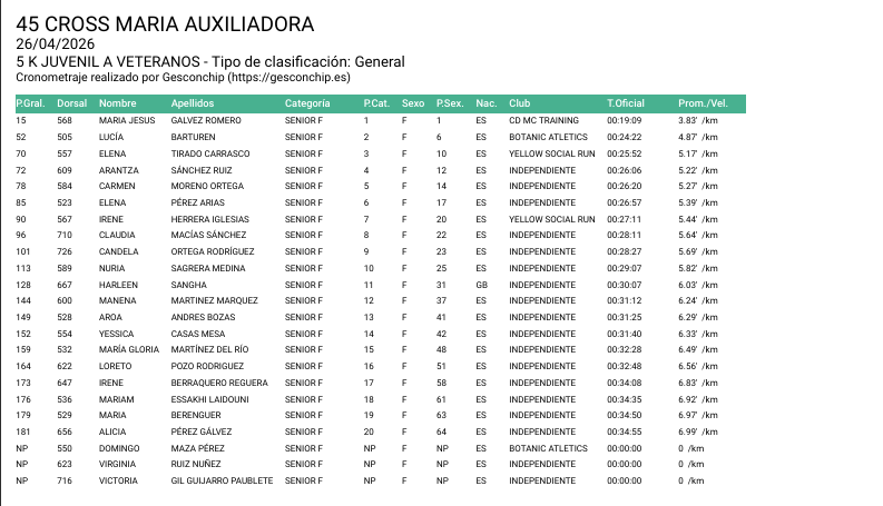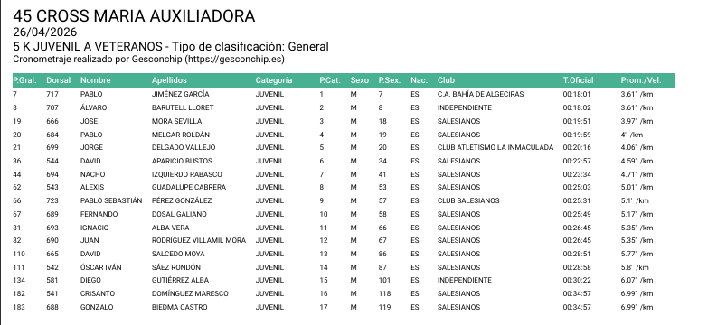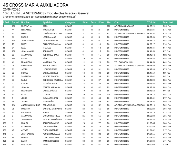 Mustapha Sabili (Badajoz Atletismo), Andrea Cantizano Pasamar (Club Atletas Veteranos Algeciras) se han proclamado campeones del 45º Cross María Auxiliadora en la categoría senior de la carrera de 10.000 metros; mientras que en la misma división, pero sobre 5 kilómetros, se han hecho con el título Alexander Somville (Matruner) y Carmen Delgado Allevato (Salesianos).
