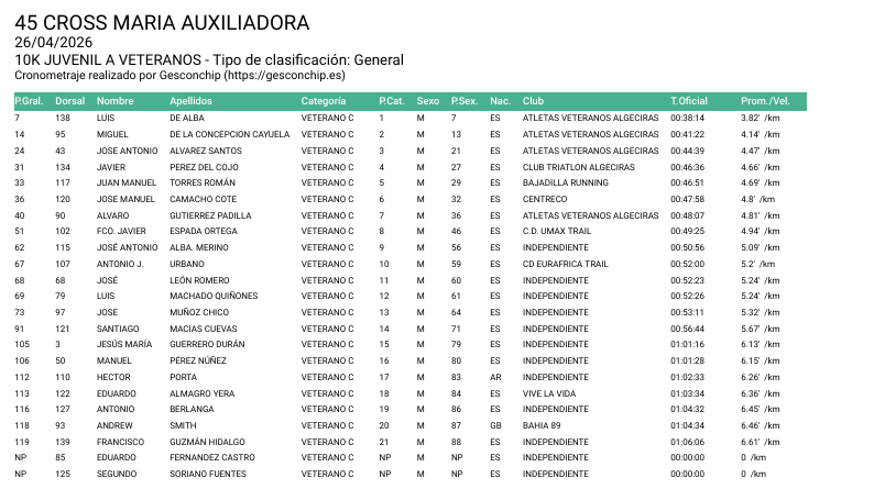 El corredor de origen marroquí formado en el Club Atletismo Bahía de Algeciras (y que ayer estuvo con su club en el encuentro de División de Honor ganando la prueba de 3.000 obstáculos, siendo tercero en los 3.000 metros) ha hecho un espectacular tiempo de 33.29 (una media de 3:35 el kilómetro), aventajando en cuatro minutos al subcampeón, Fernando Ríos Learde -Independiente- con 37:31; mientras que Cantizano ha empleado un crono de 41:41, doce minutos menos que la siguiente de su categoría, María del Carmen García Pérez (53:46).