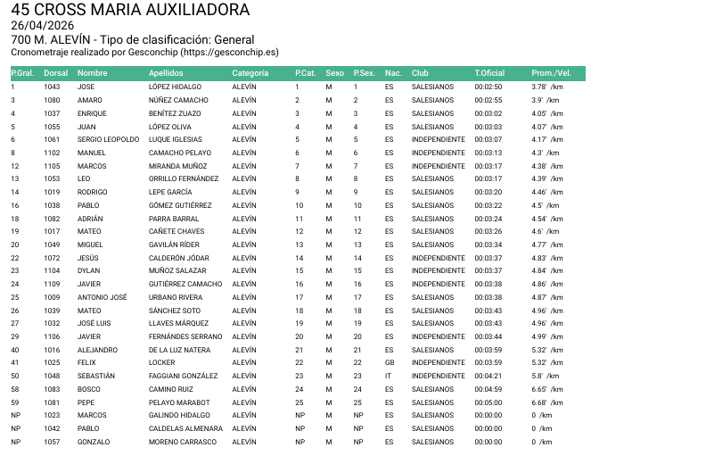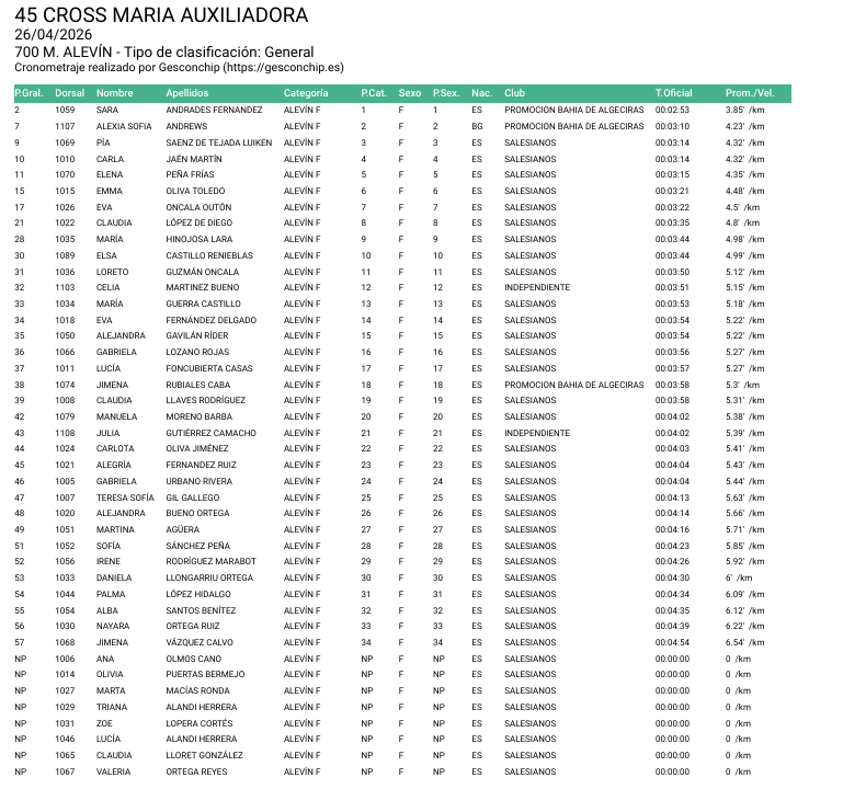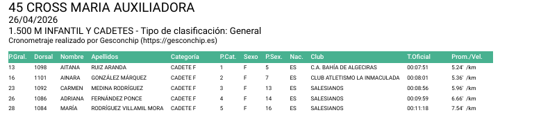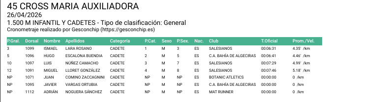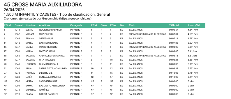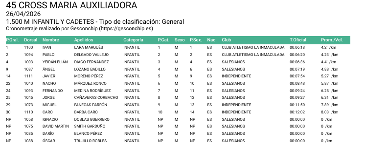 CLASIFICACIONES PRUEBA 1.500 METROS